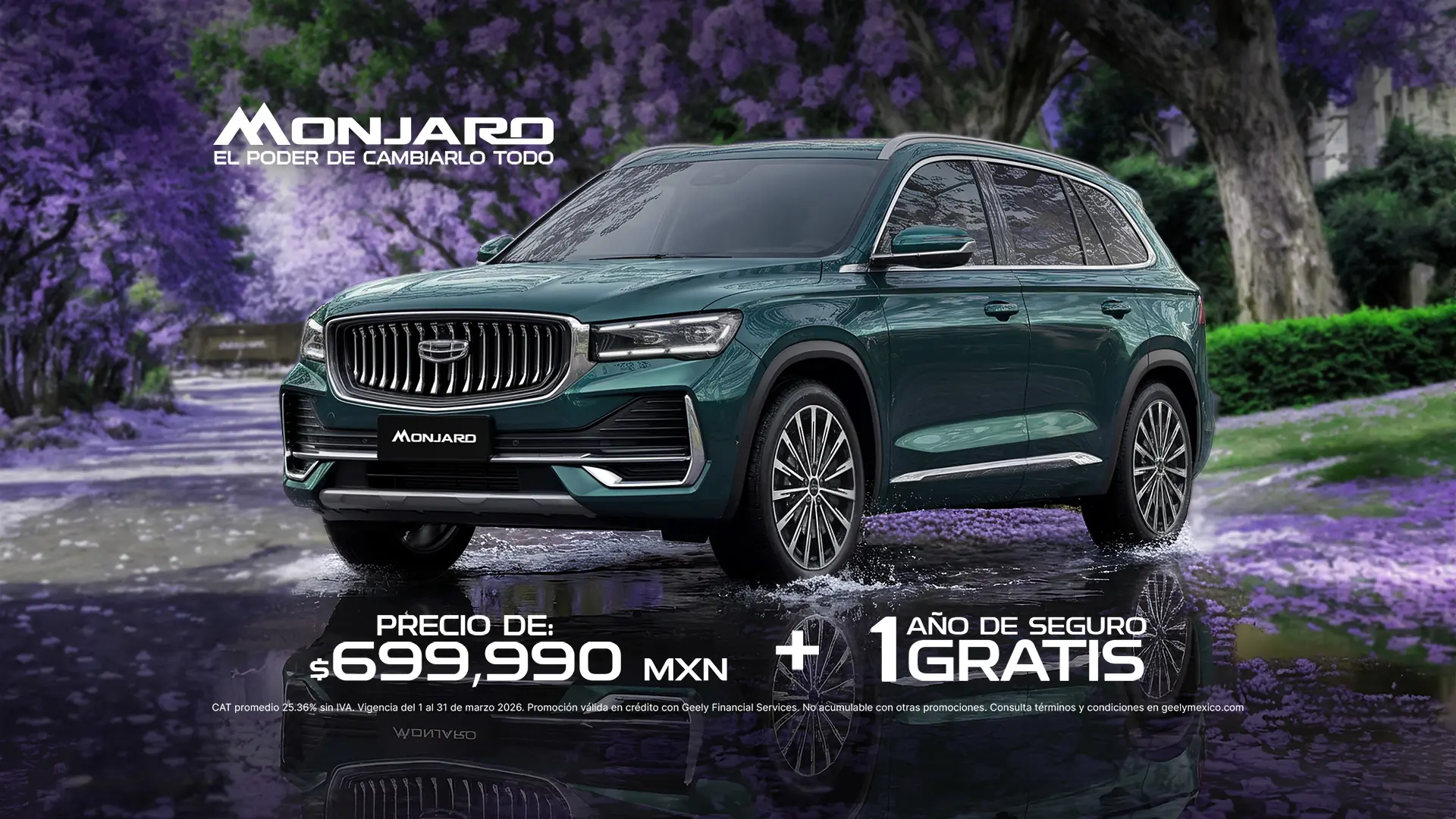 El año de seguro gratis aplica únicamente para el modelo Monjaro 2026 en su versión GF, en operaciones de crédito a través de Geely Financial Services (BBVA). Válido solo con aseguradoras participantes. Consulta especificaciones y condiciones con tu Distribuidor autorizado Geely. Al finalizar el periodo del seguro gratis, el cliente deberá contratar un seguro conforme a lo señalado en su contrato de crédito.